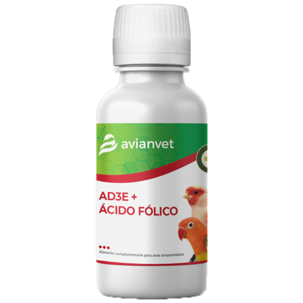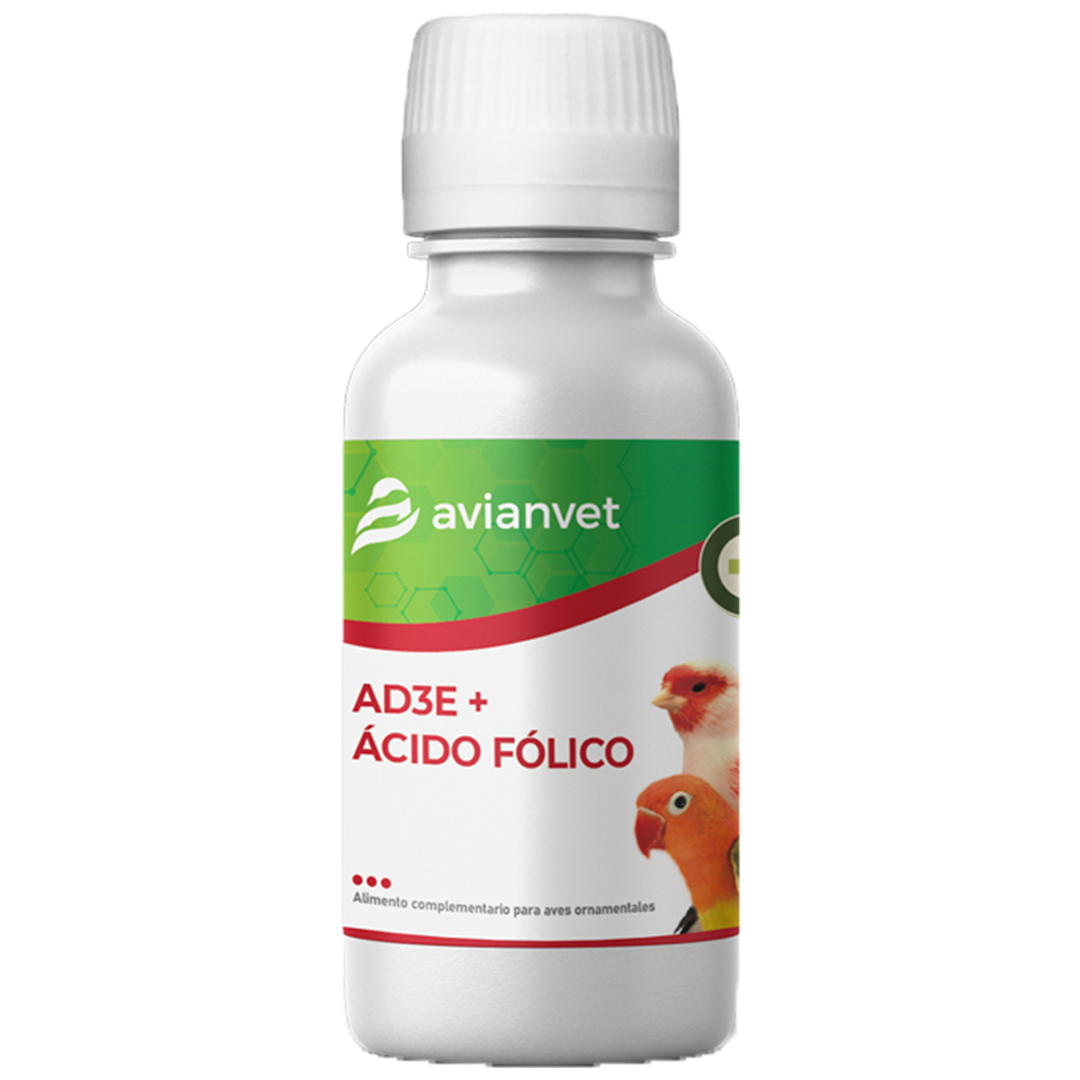 Introducing Avianvet AD3E + Folic Acid 100 ml, a premium complementary food specifically formulated for ornamental birds, providing essential vitamins for optimal health and breeding performance.